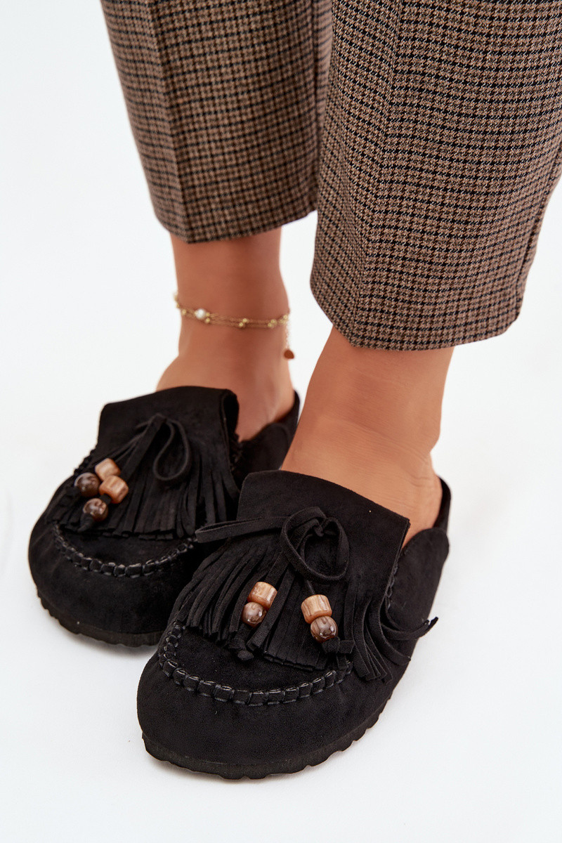 Damenhausschuhe Mule mit Fransen I Korallenfarbeikami schZuarze Farbe Belissa