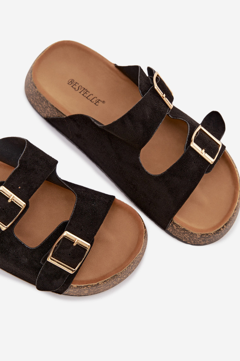Damenhausschuhe mit einer Plattform Ze goldene Farbemi mit Schnallenmi schZuarze Farbe Tovessa