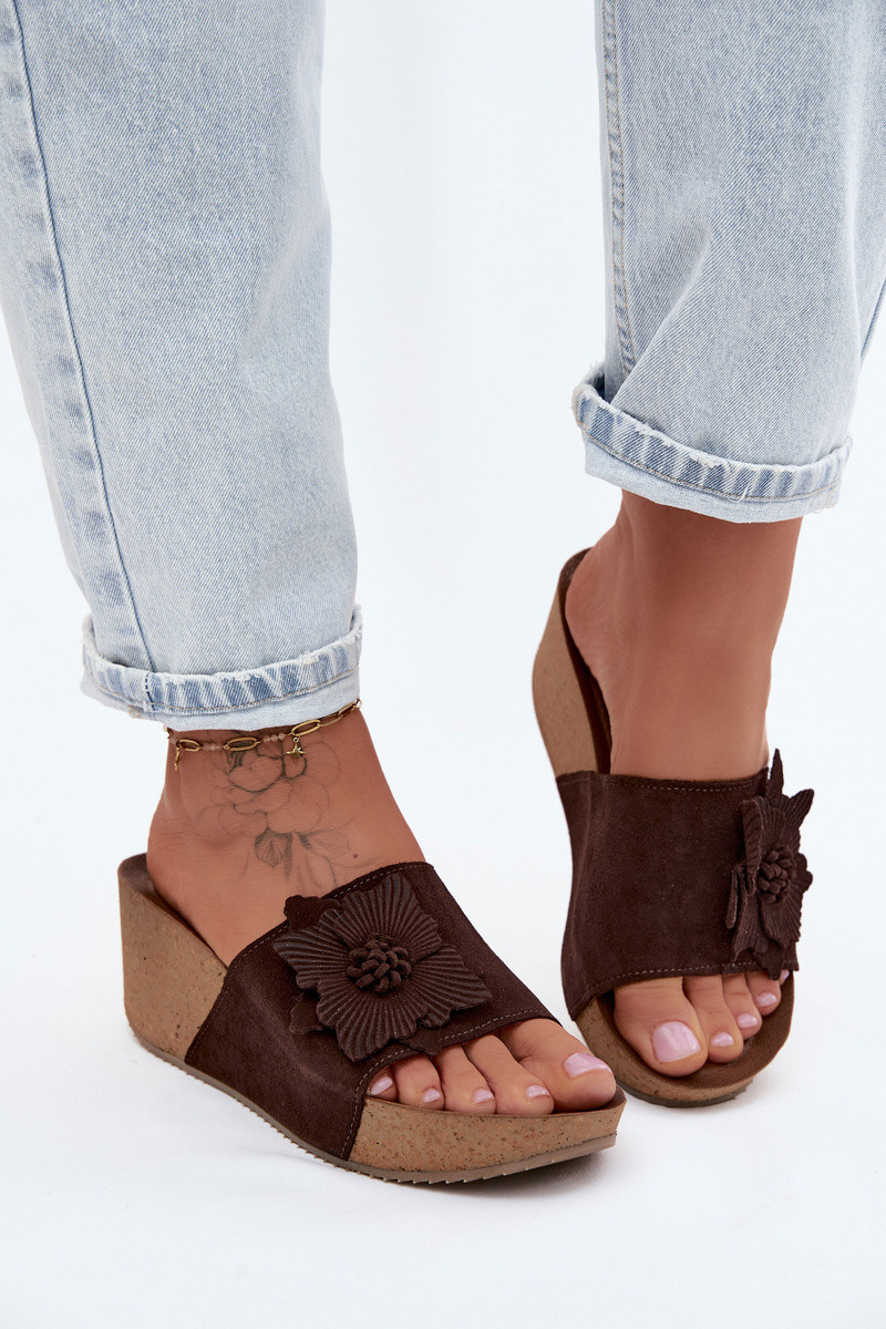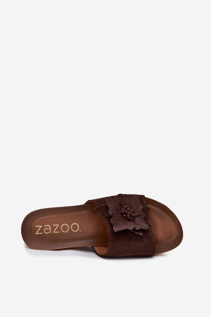 Faux-Suede Damen Hausschuhe mit Plattform und dekorativen Blumen in cappuccinofarbenem Design Zazoo 40312