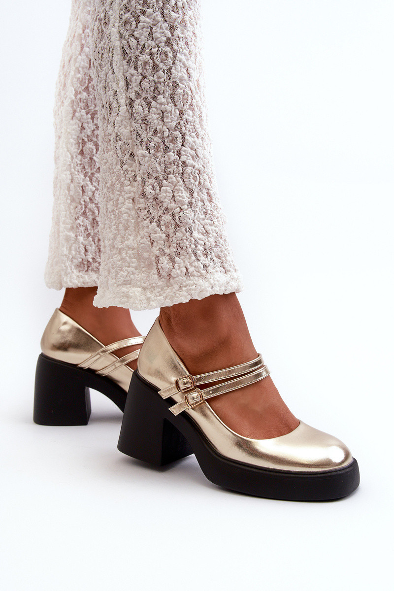 Goldfarbene Schuhe mit breitem Absatz aus Kunstleder Halmina