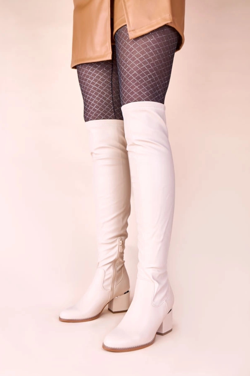 Sandfarbene Overknee-Stiefel über dem Knie mit dekorativem Absatz Onka