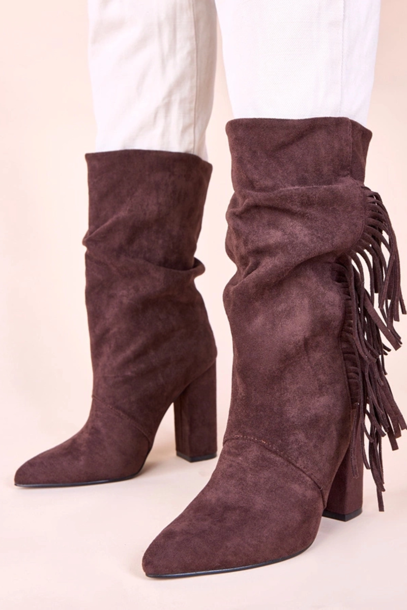 Braune Stiefeletten mit Blockabsatz und Fransen Briena