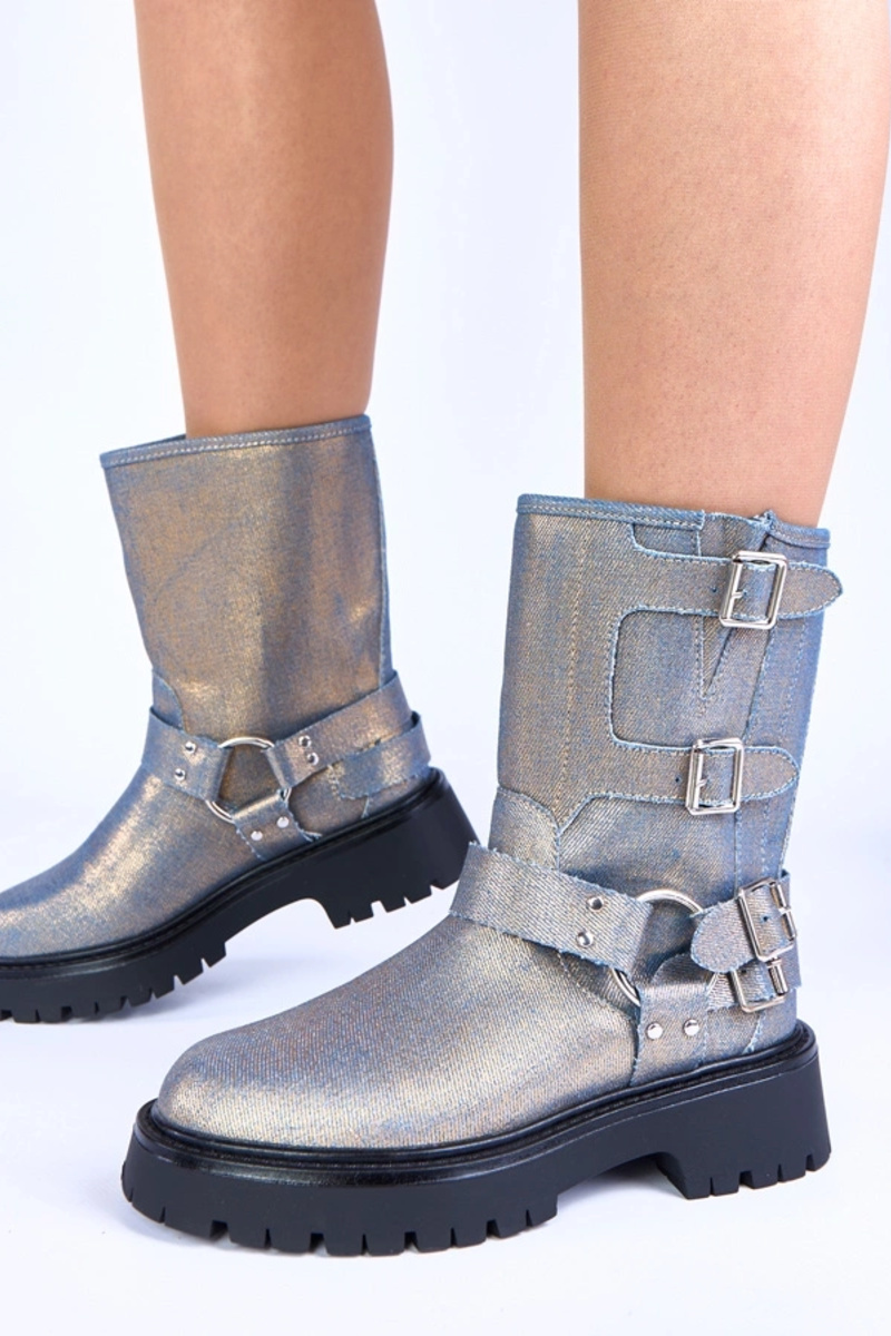 Blaue Stiefel mit goldfarbenen Schnallen Cara