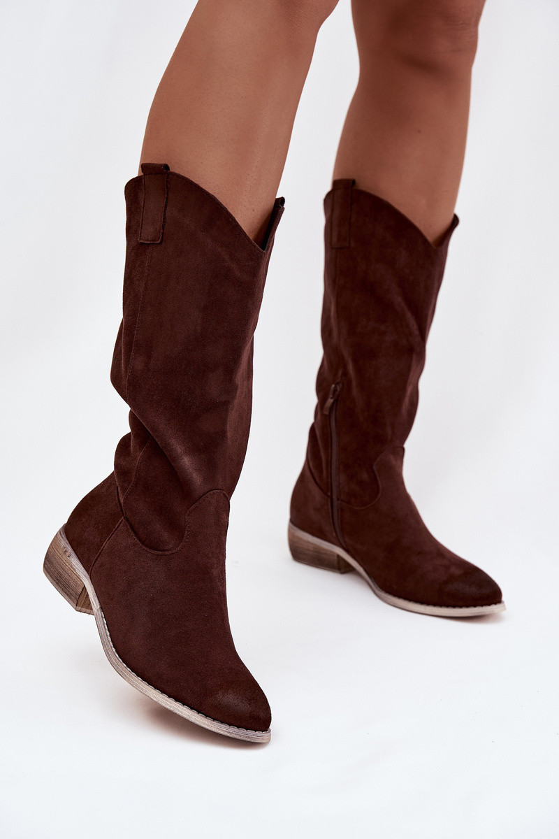 Schokoladenfarbene Cowboy-Stiefel mit niedriger Absatz aus Kunstwildleder Cherrie