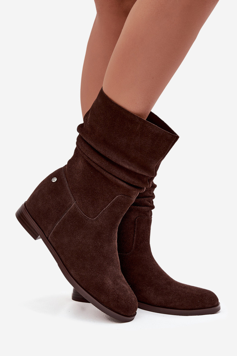 Schokoladenfarbene Leder Wildleder Damenstiefel mit Rüschen, gefüttert Tai turiciejka K7211-02