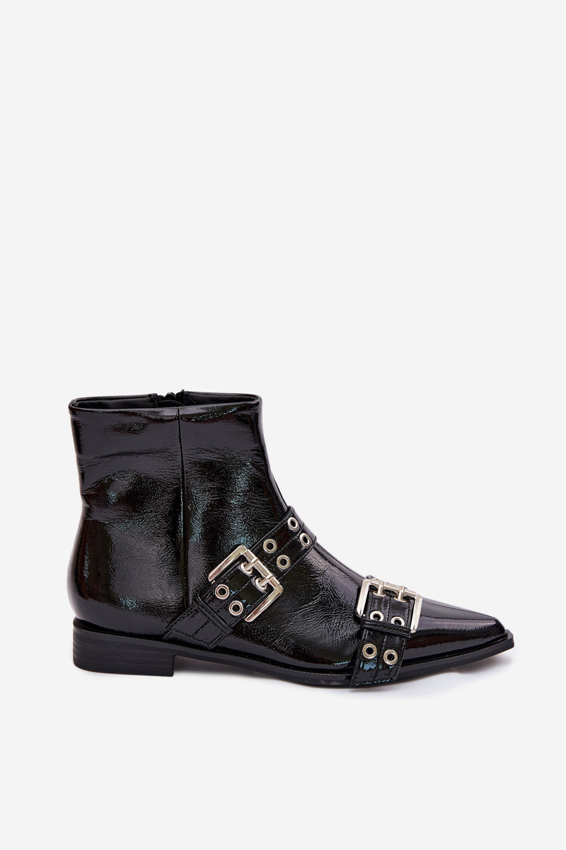 avec effet vernis Bottes pour femmes avec des talons larges avec des bandes I avec bouclesmi couleur noire Hamira