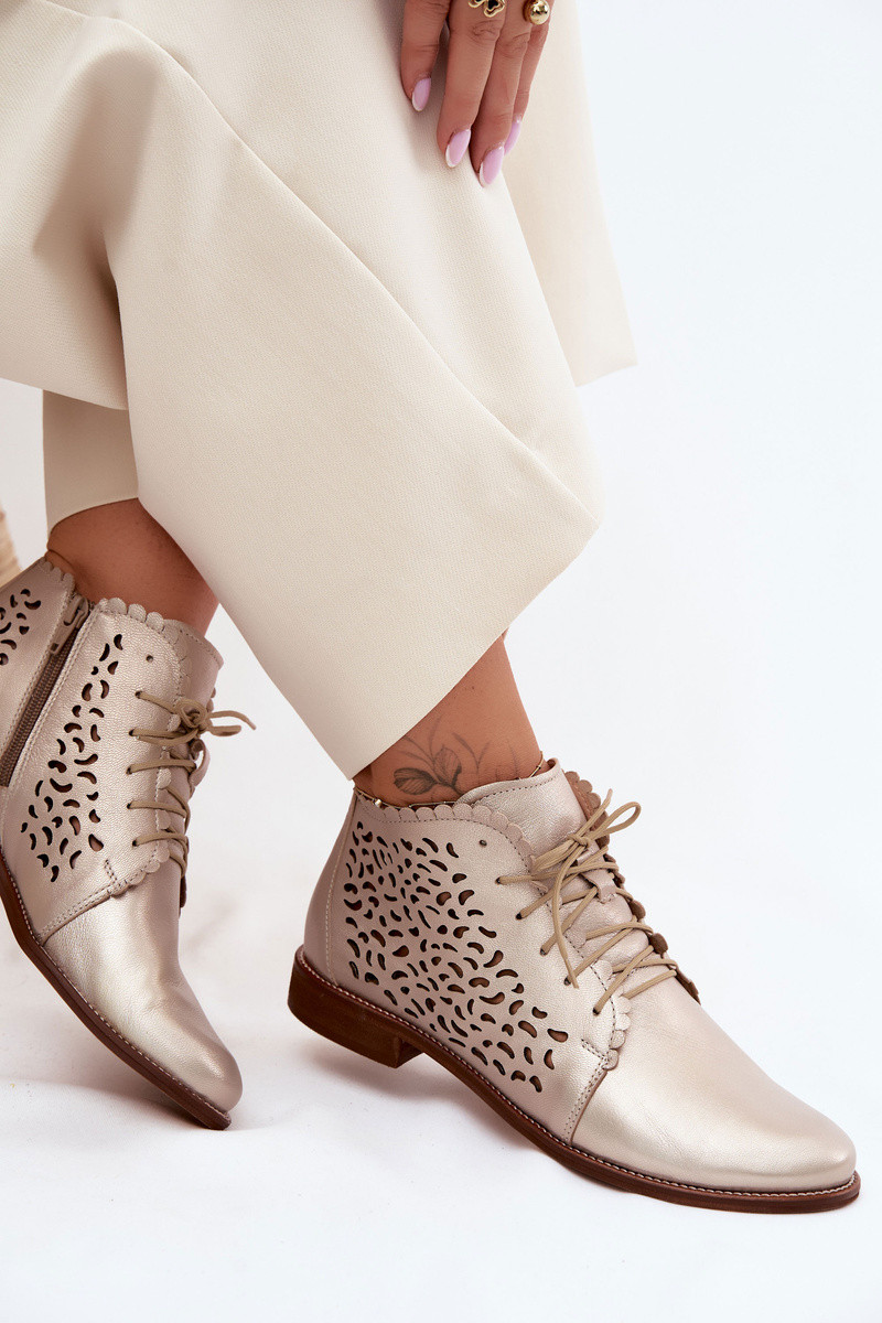 Bottines en cuir perforées dorées élégantes avec talons larges Zazoo 4078