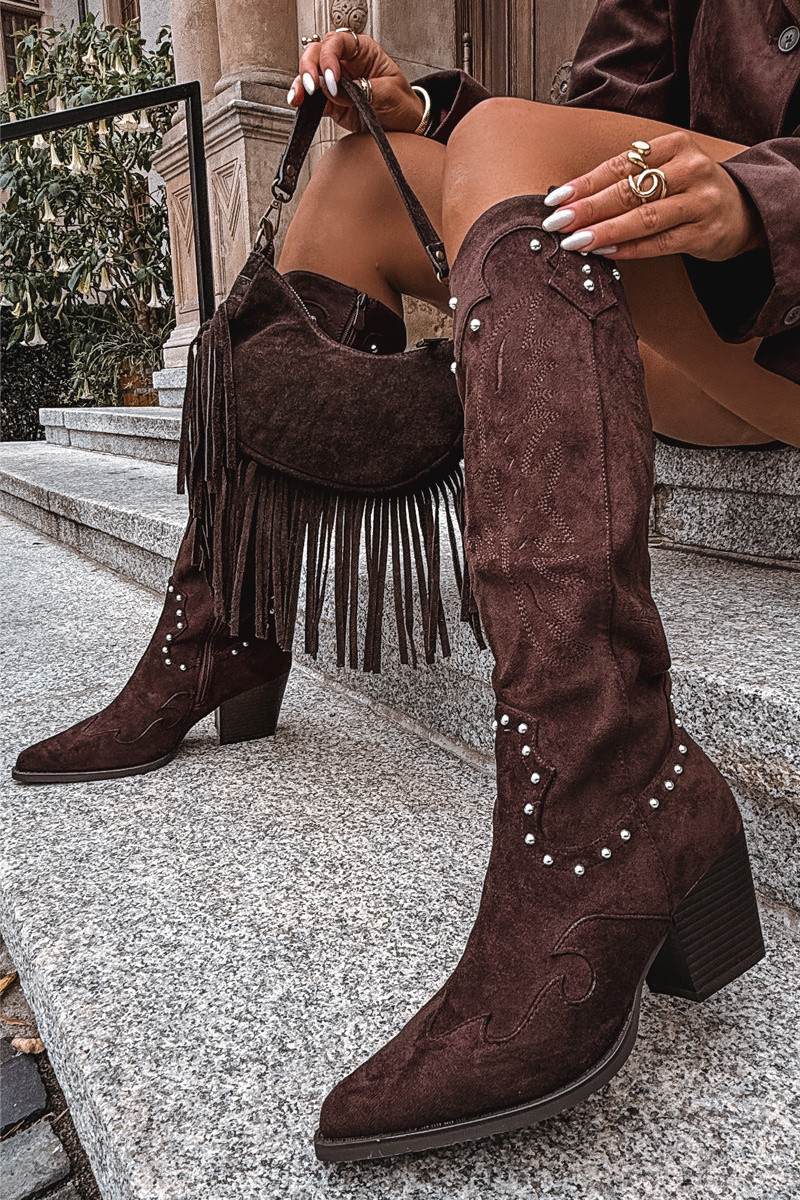 Bottes hautes pour femmes en chocolat au style cowboy avec décoration et talons Darella