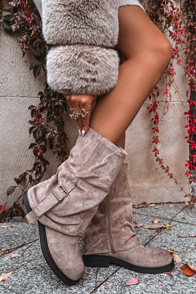 Bottes longues pour femmes avec cheville embossée, milieu de mollet, avec boucles, couleur chaki Minelle