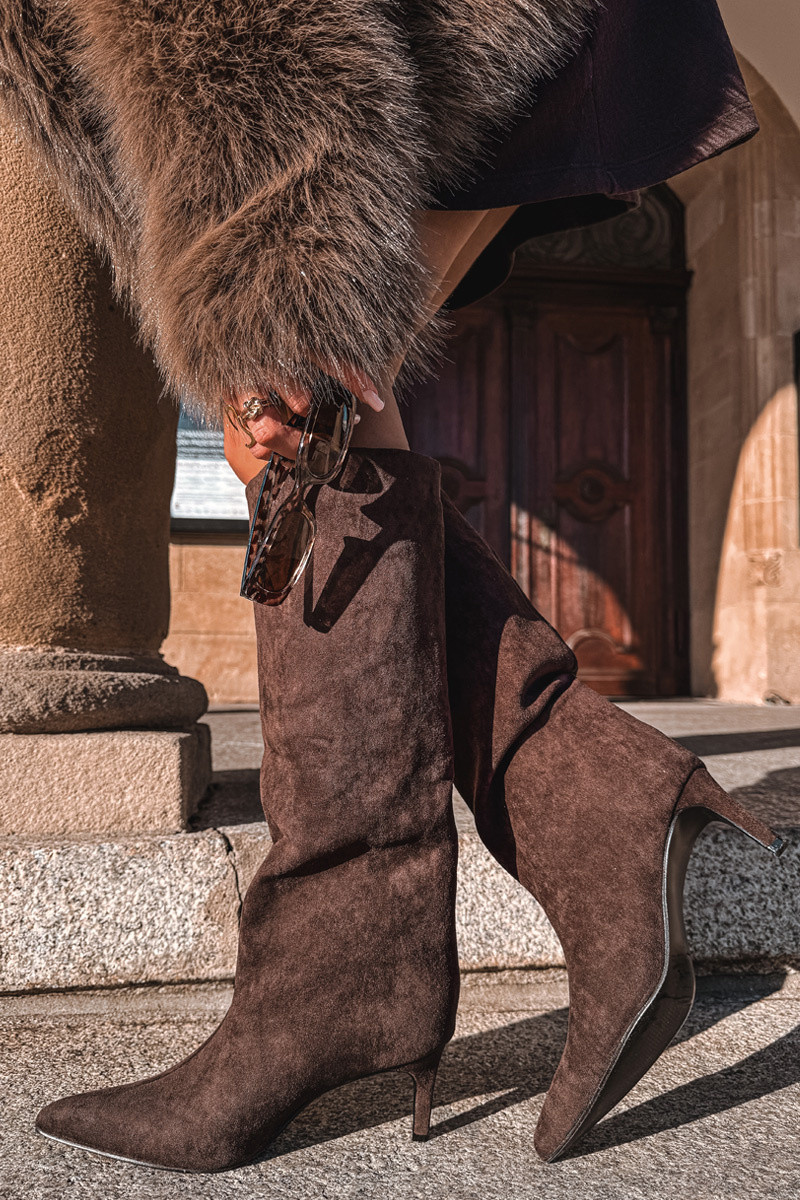 Bottes noires hautes pour femmes en suédine synthétique, à enfiler, avec talons fins, couleur chocolat Phelin