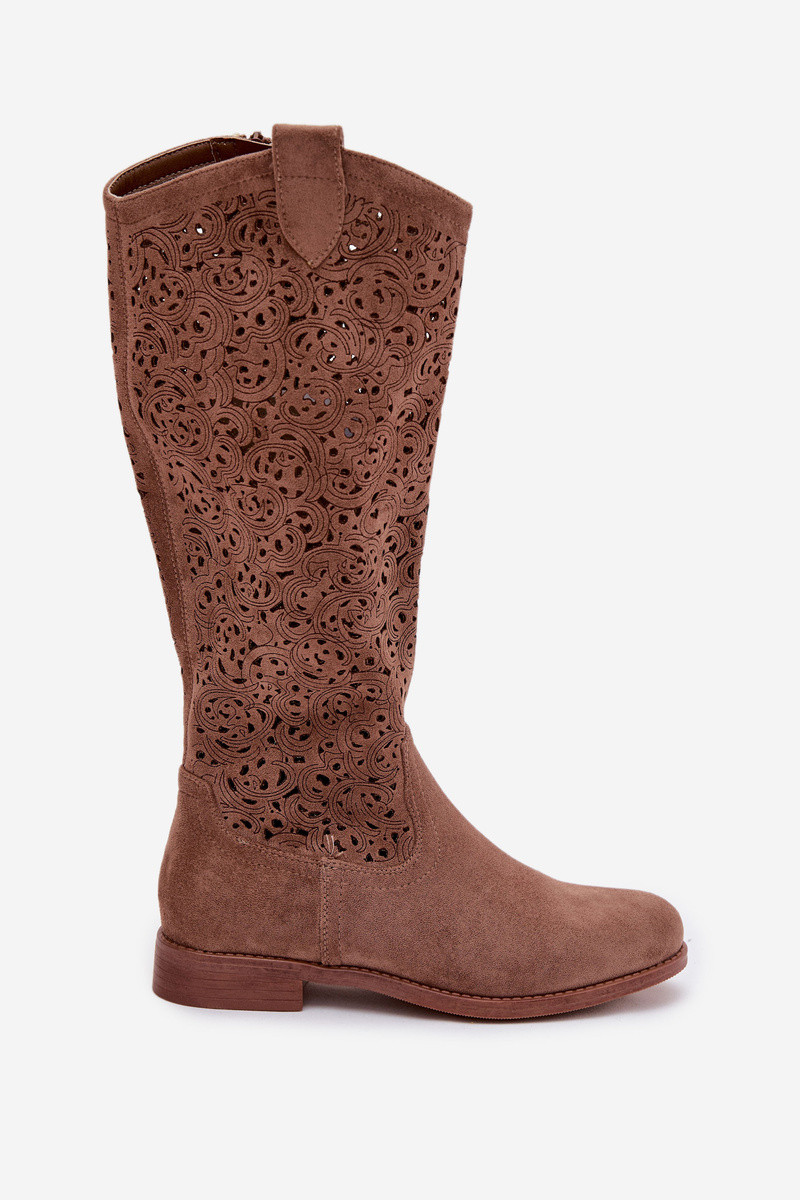 Bottes longues pour femmes avec éléments ajourés et larges talons S.Barski HY61-8023, couleur marron