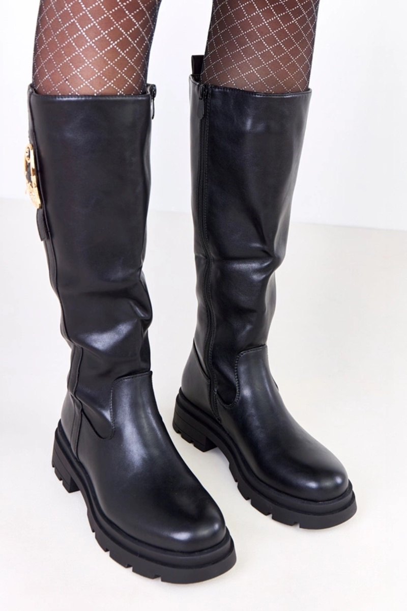 Bottes longues en simili cuir noires avec décoration dorée Meliros