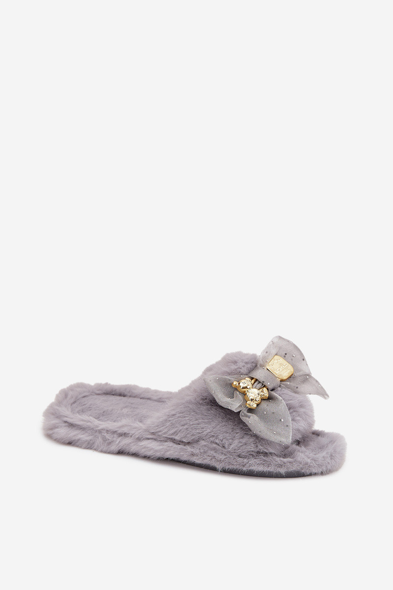 Chaussons pour femmes gris avec fourrure, nœuds et décorations dorées « Nolara »