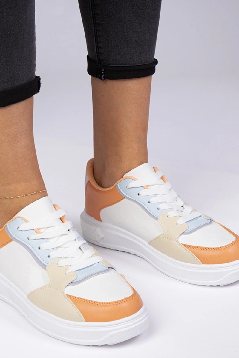 Baskets sportives blanches et orange en simili cuir Lavilia
