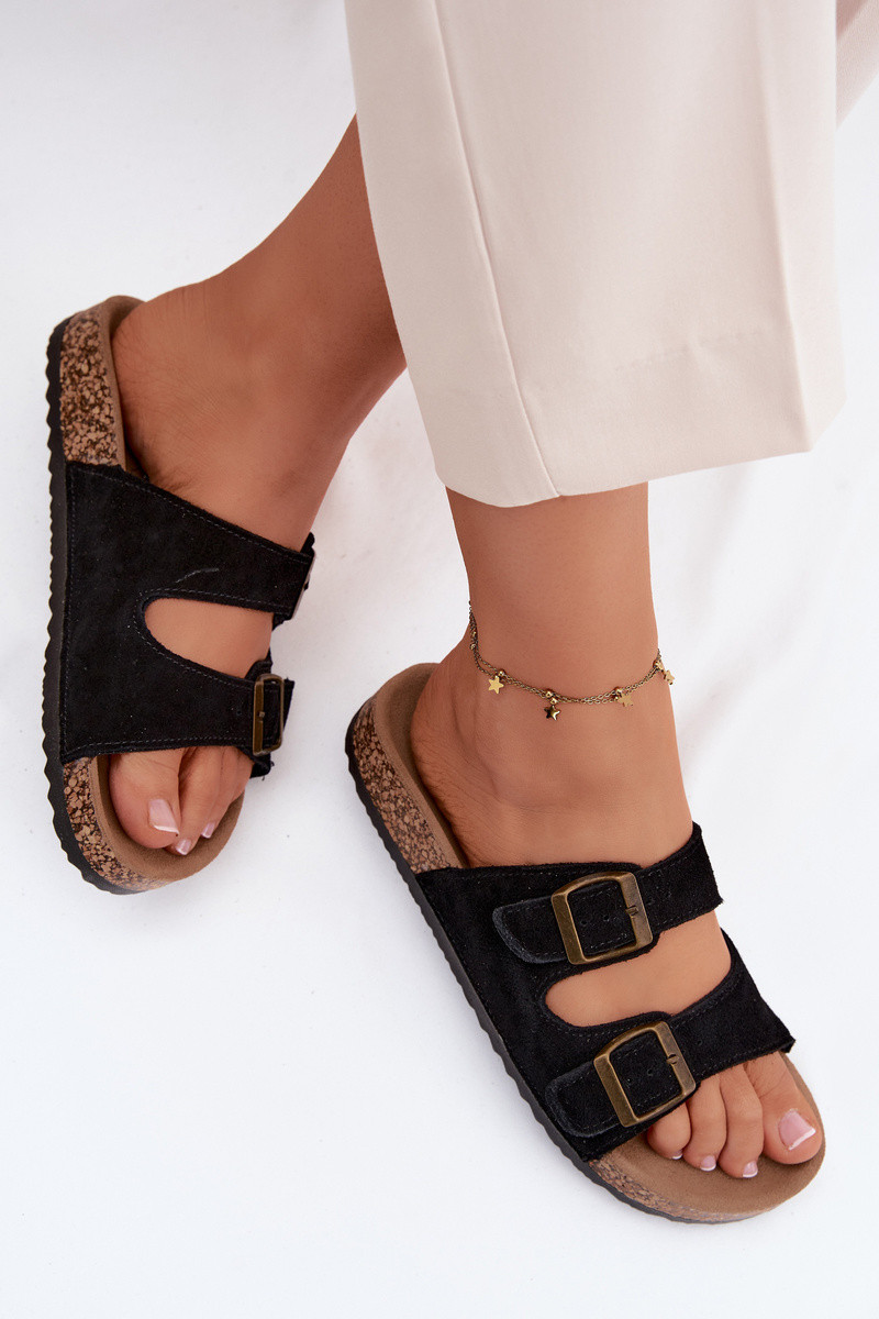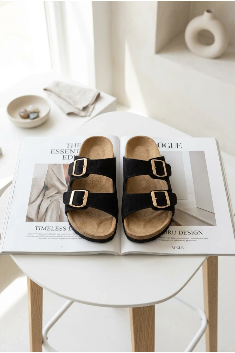 Pantoufles de Suèdes Sur une semelle en liège avec boucles couleur noire Tavira