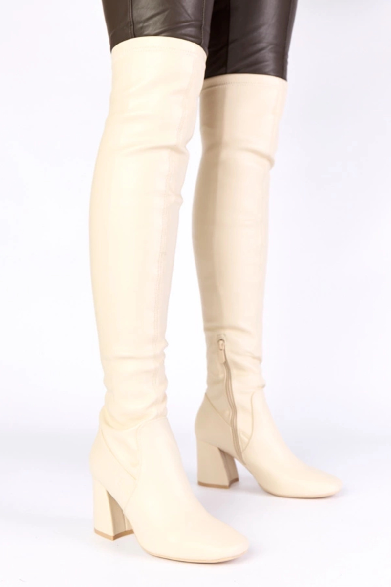 Zandkleurige lange laarzen boven de knie op een hak Louna