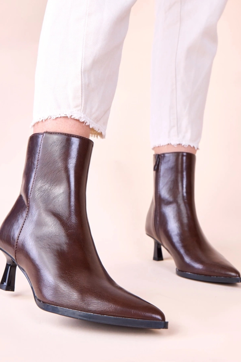 Bruine enkellaarsjes op een hoge hak in eend-type Mordi