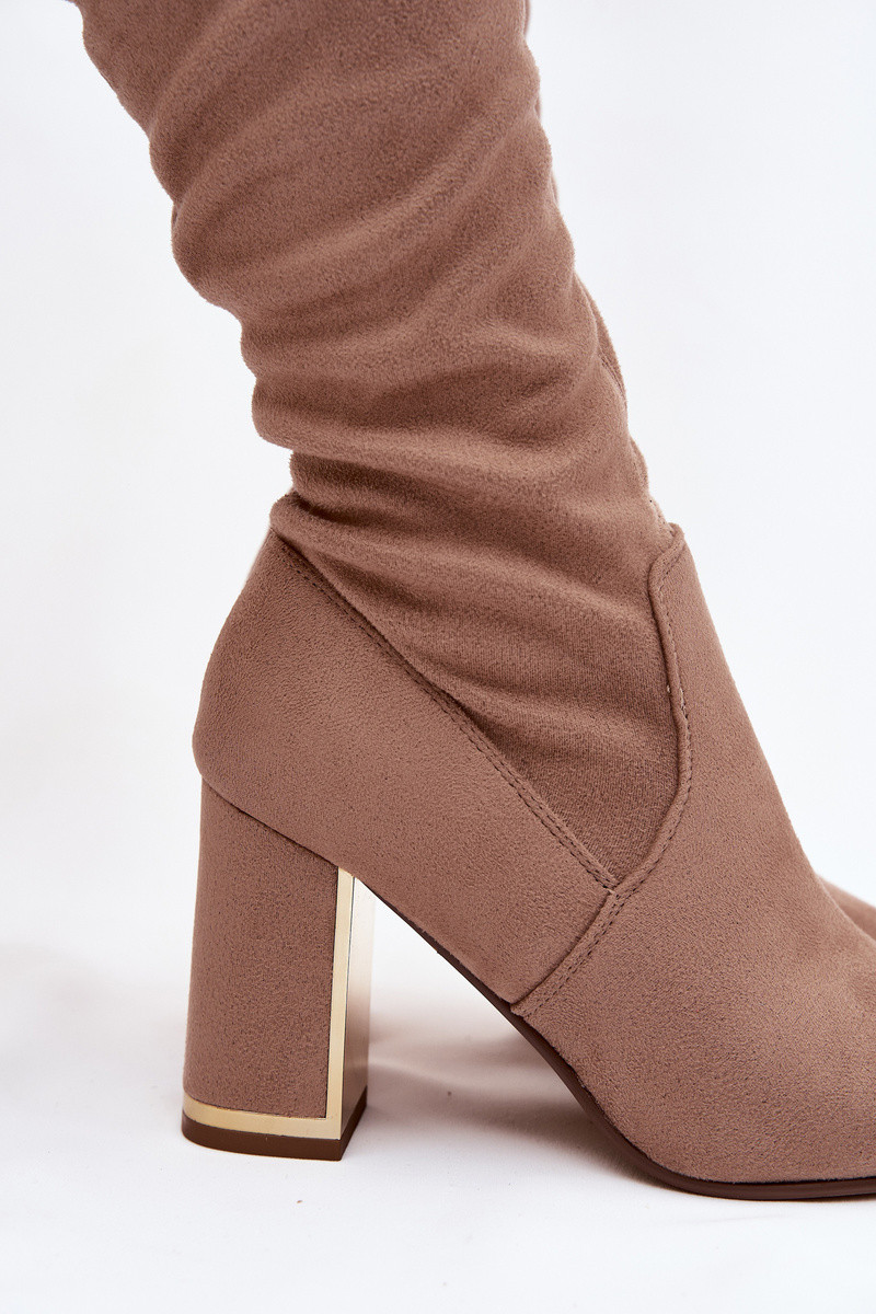 Zandkleurige vrouwelijke boven-de-knie lange laarzen met hakken van kunstsuède Thamine