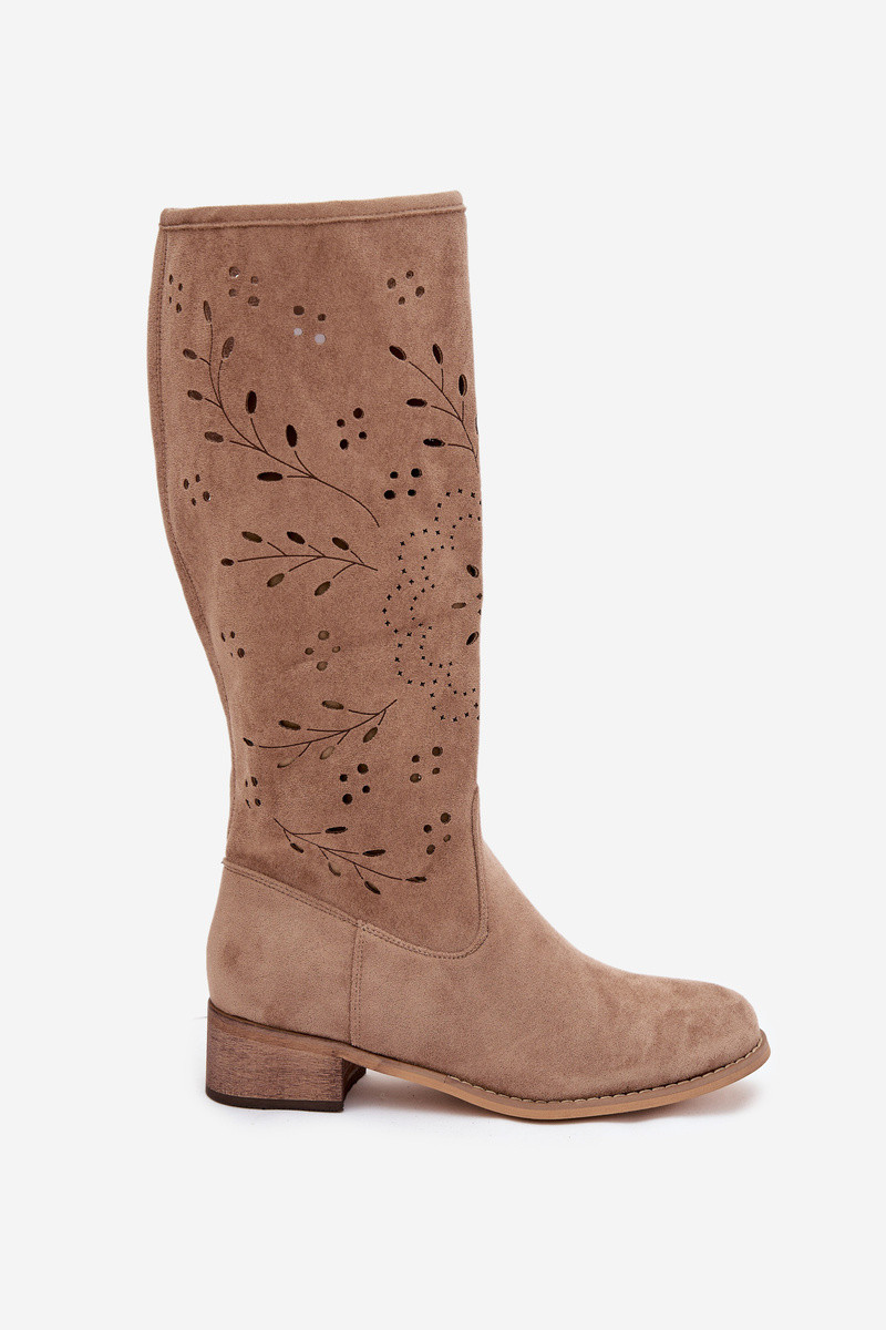 Zandkleurige dames kniehoge laarzen met ajour-elementen Helinna
