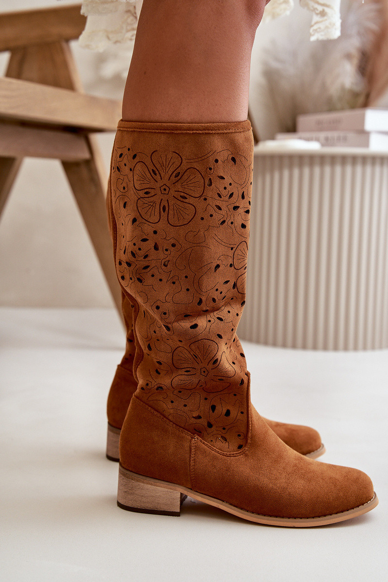 met elementen van opengeInerkt dameslaarzen Op een lage hak van eco-suèdeoIne Vastgemaakt Opar het kasteel bruine kleur Orchides