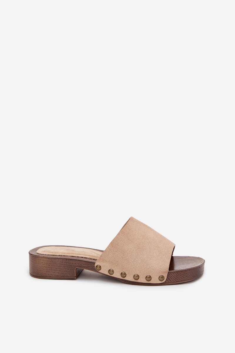 Damespantoffels met brede hakken in goudkleur met zandkleurige studs