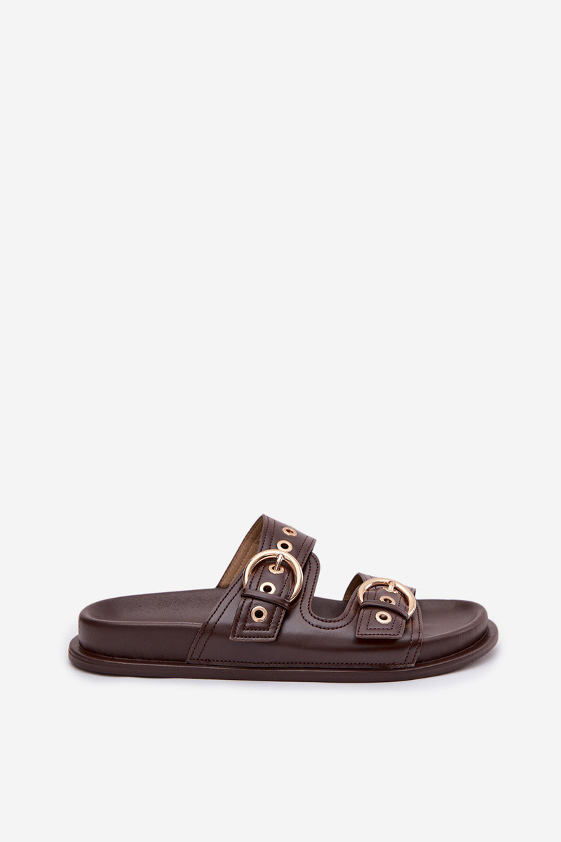 Dames chocolade kleurige pantoffels met gouden gespen van kunstleer Bellarya