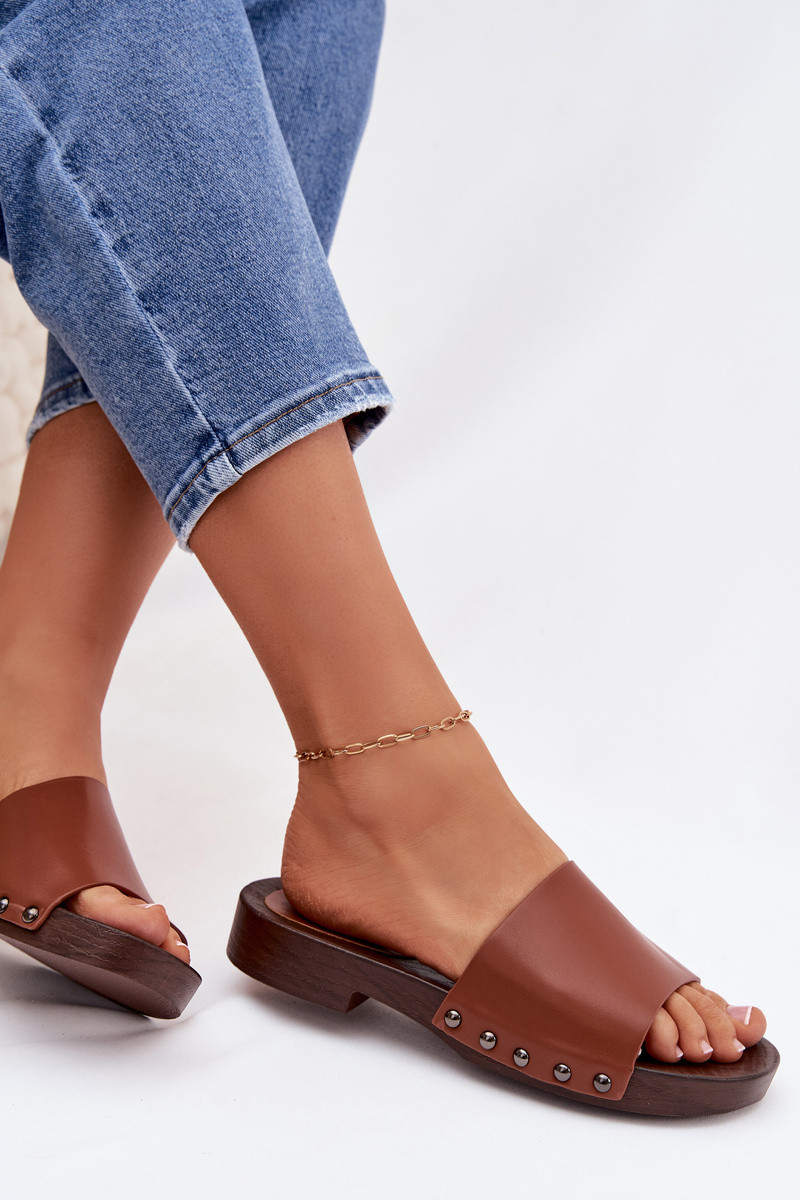 Dames slippers met studs en brede hakken in bruin Brinalle