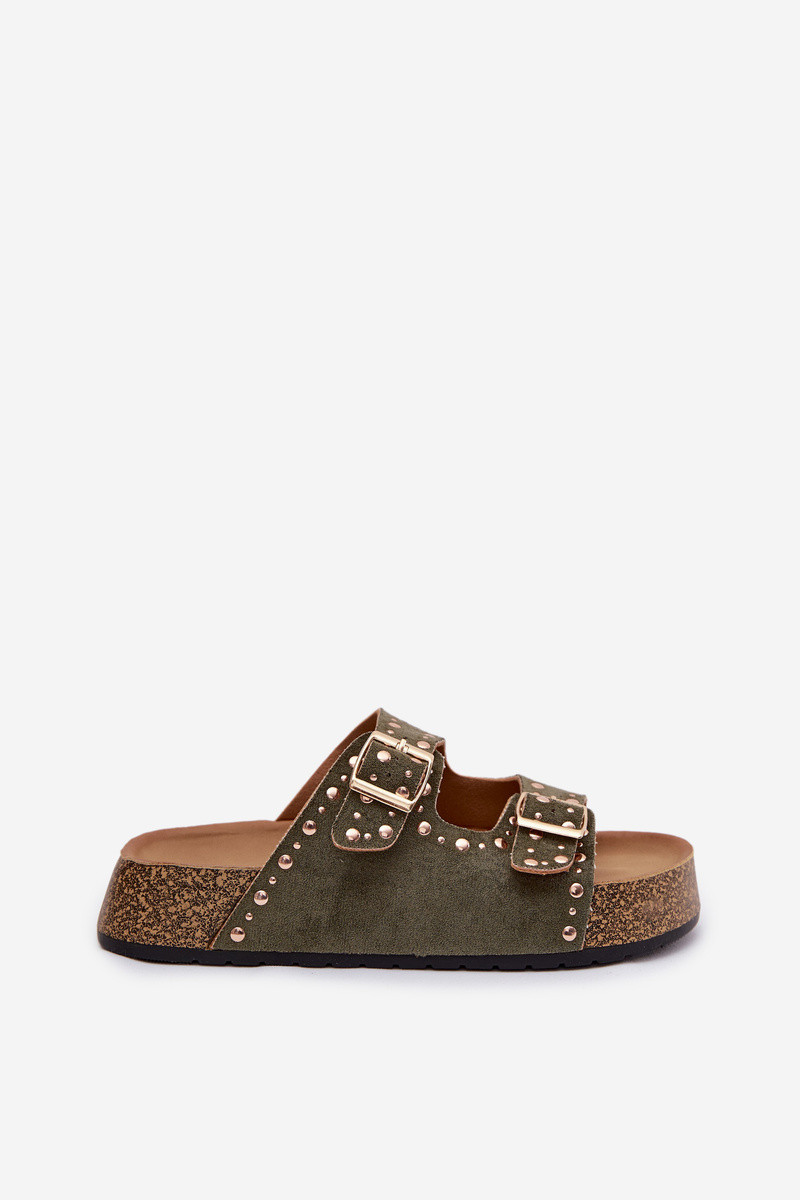 Dames slippers in gouden kleur met gespen en spijkers in kaki kleur Tervina