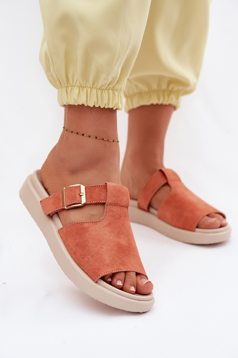 Dames suède pantoffels met platform met gouden gespen oranje Zemela