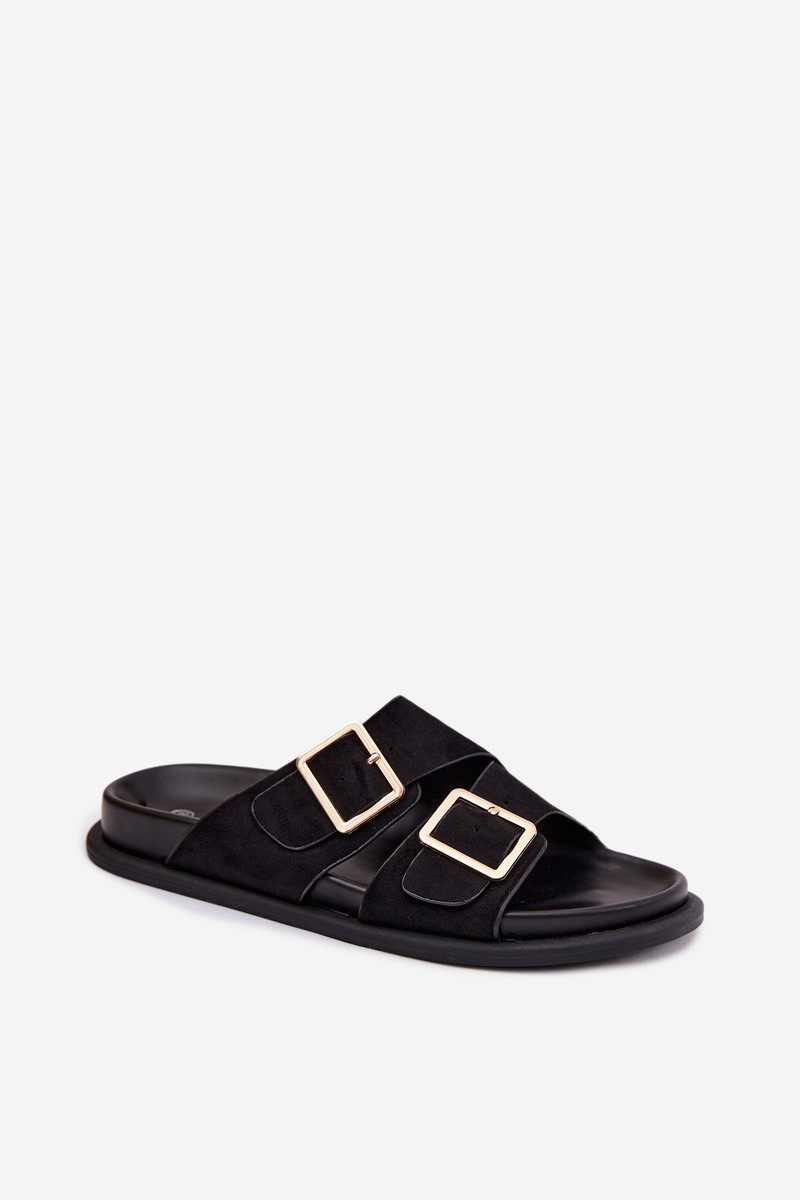 Zwarte slippers van faux suede met gouden gespen Selissea