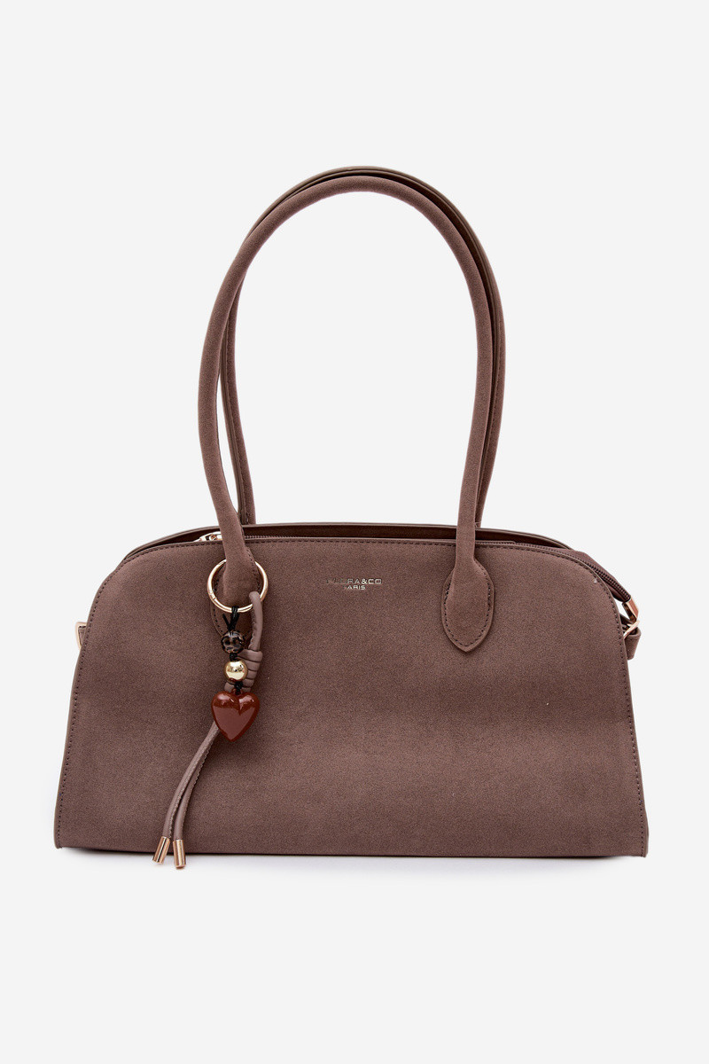 Violette tas met sleutelhanger en gespen in kunstsuède bruin